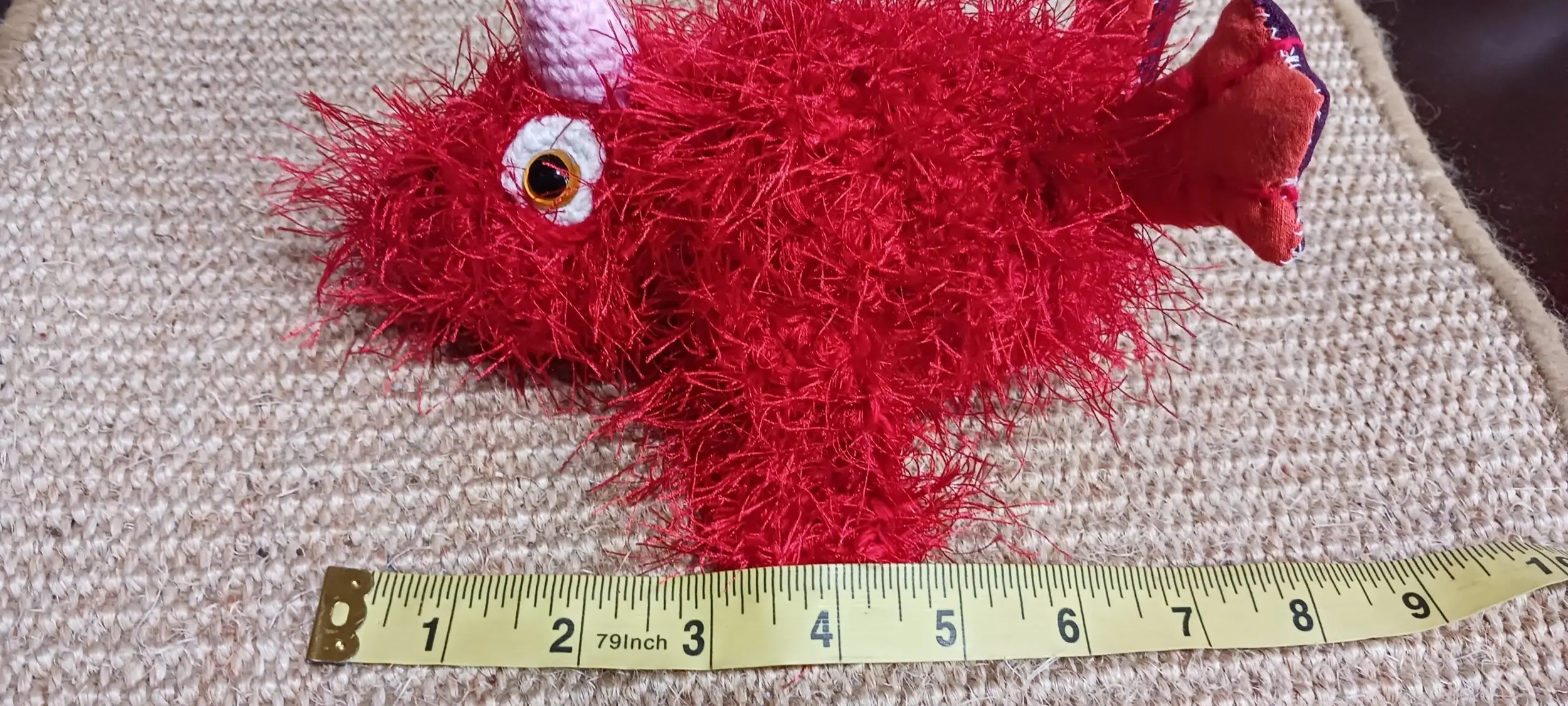 Very colorful, sturdy.Unusual and one of a kind. Made from fluffy yarn .Size 9 inches. Great for little present. Safe for kids. Eyes permanent (not glued)